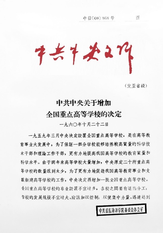 196010月,在《中共中央關(guān)于增加全國(guó)重點(diǎn)高等學(xué)校的決定》中,公布了64所全國(guó)重點(diǎn)高校,山東海洋學(xué)院被列為13所綜合大學(xué)之一。由此,學(xué)校步入特色發(fā)展的歷史新階段。